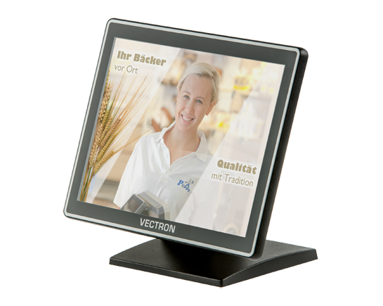 Das C100 kann direkt an den stationären Kassensystemen Vectron POS Mini II, Vectron POS Vario II und Vectron POS Touch angebracht werden und ist im Anzeigewinkel verstellbar*. Alternativ ist das Kundendisplay als standalone-Gerät mit Standfuß erhältlich.